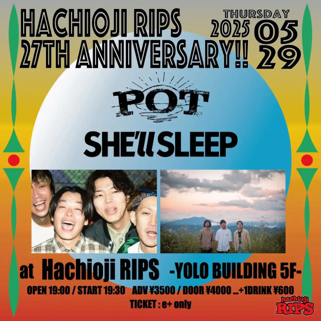 “Hachioji RIPS 27th Anniversary” SCHEDULE 2025/05/29(木) 八王子RIPS OPEN 19:00 / START 19:30 ADV ¥3,500 / DOOR ¥4,000 SHE’ll SLEEP POT チケット詳細はこちら URLをコピーする 報告する