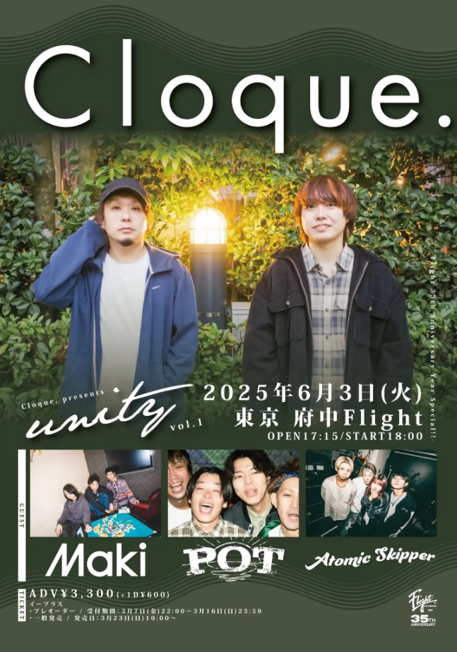 Cloque. presents unity vol.1 -Flight 35th Anniversary Year Special!!- SCHEDULE 2025/06/03(火) 府中Flight 17:15 / 18:00 ADV ¥3,300 Cloque. Maki Atomic Skipper POT チケット詳細はこちら URLをコピーする 報告する