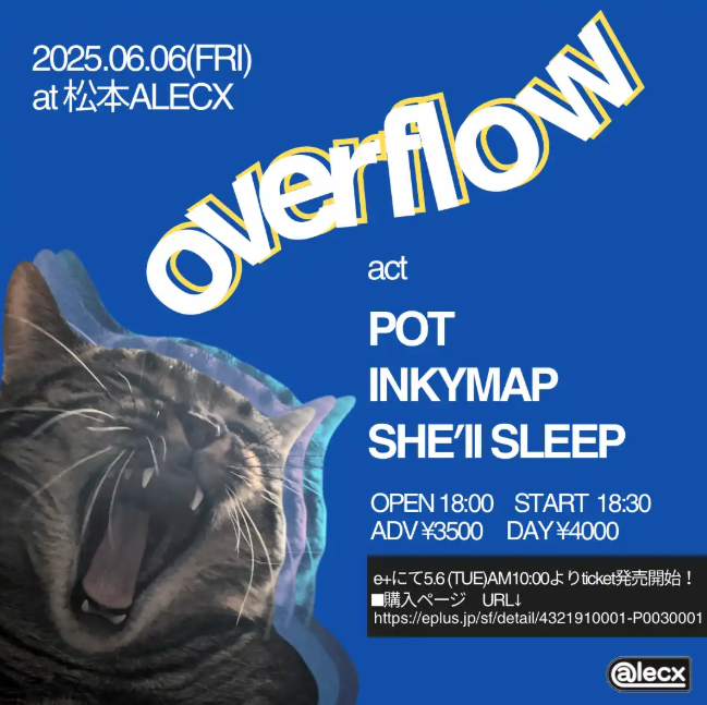 overflow SCHEDULE 2025/06/06(金) 松本ALECX OPEN 18:00 / START 18:30 ADV ¥3,500 INKYMAP SHE'll SLEEP POT チケット詳細はこちら URLをコピーする 報告する