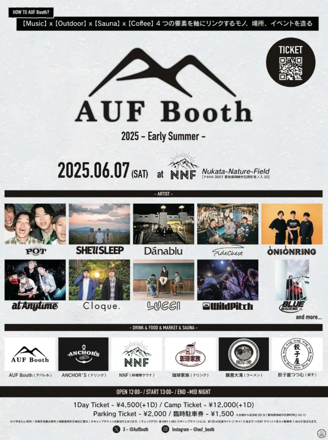AUF Booth 2025 -Early Summer- SCHEDULE 2025/06/07(土) 15:32 - NNF-Nukata Nature Field OPEN 12:00 / START 13:00 出演者多数 チケット詳細はこちら URLをコピーする 報告する
